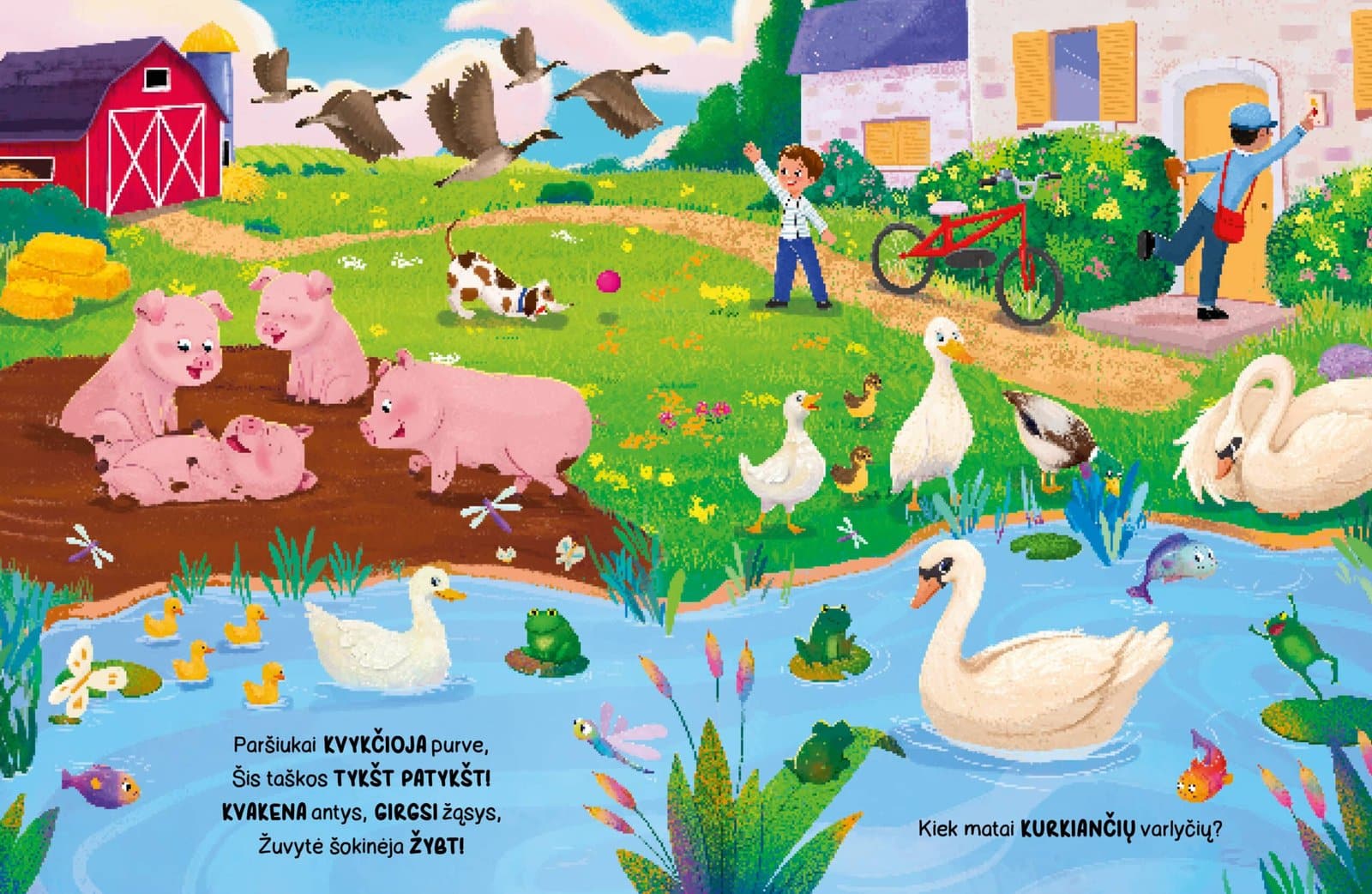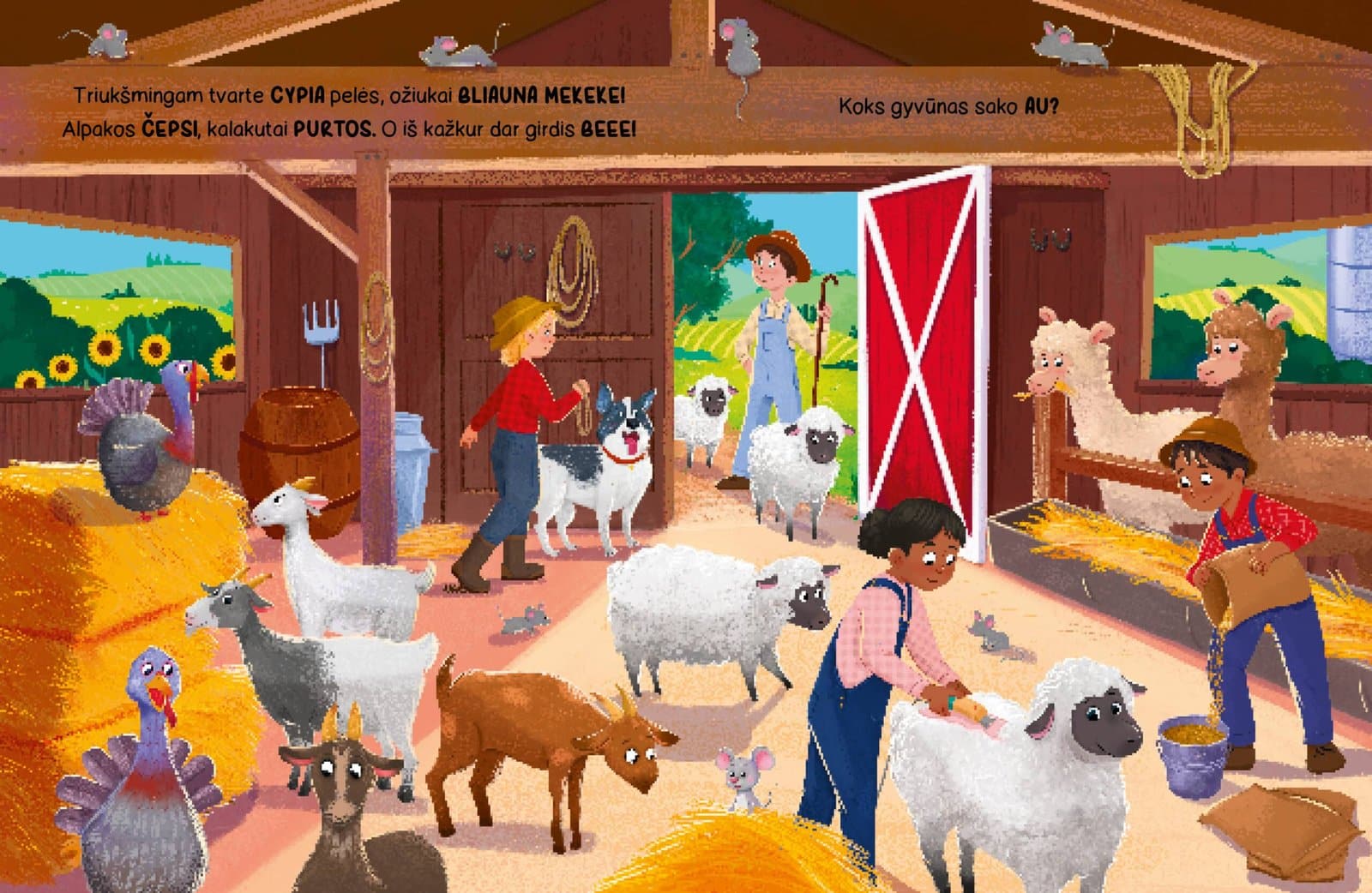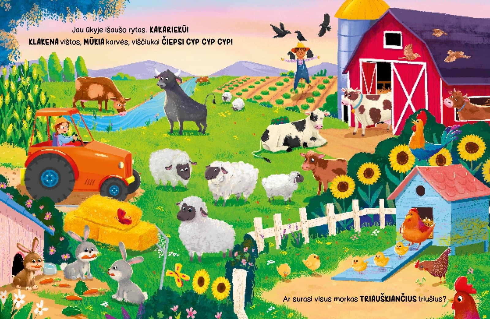 Šioje triukšmingoje knygoje išgirsi net 50 įvairių ūkio garsų – nuo cypsinčių viščiukų iki mūkiančių karvių, nuo riaumojančių traktorių iki knarkiančių ūkininkų.