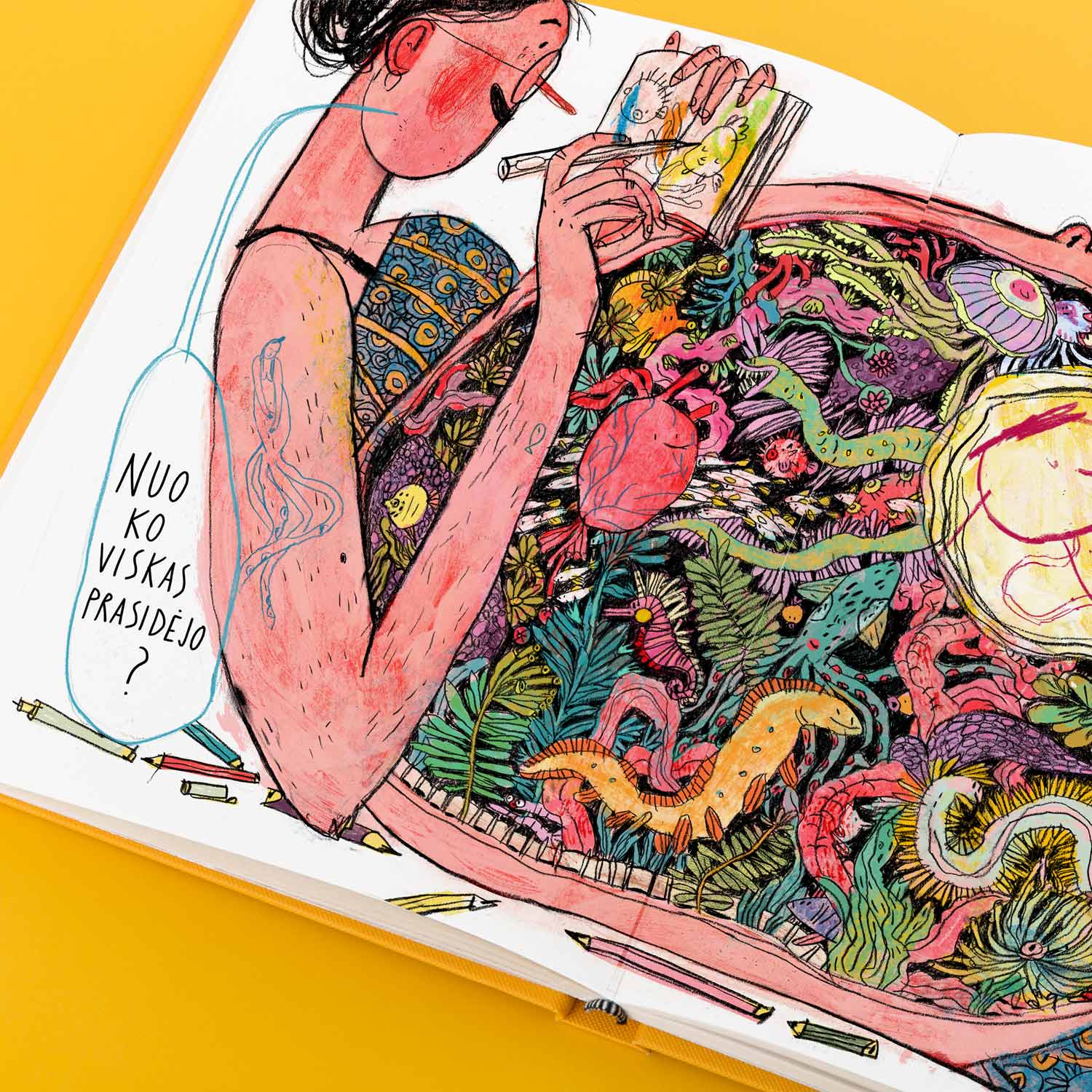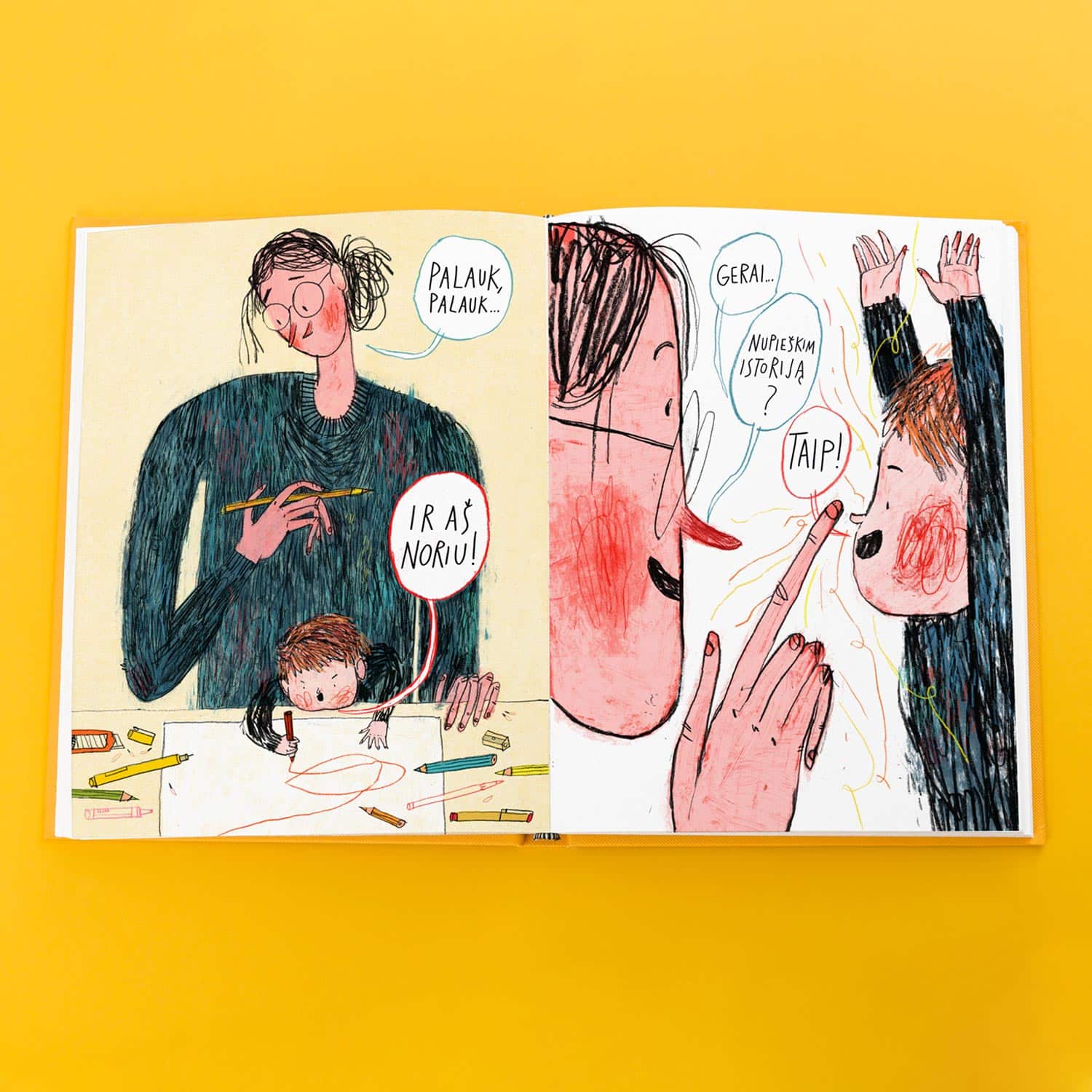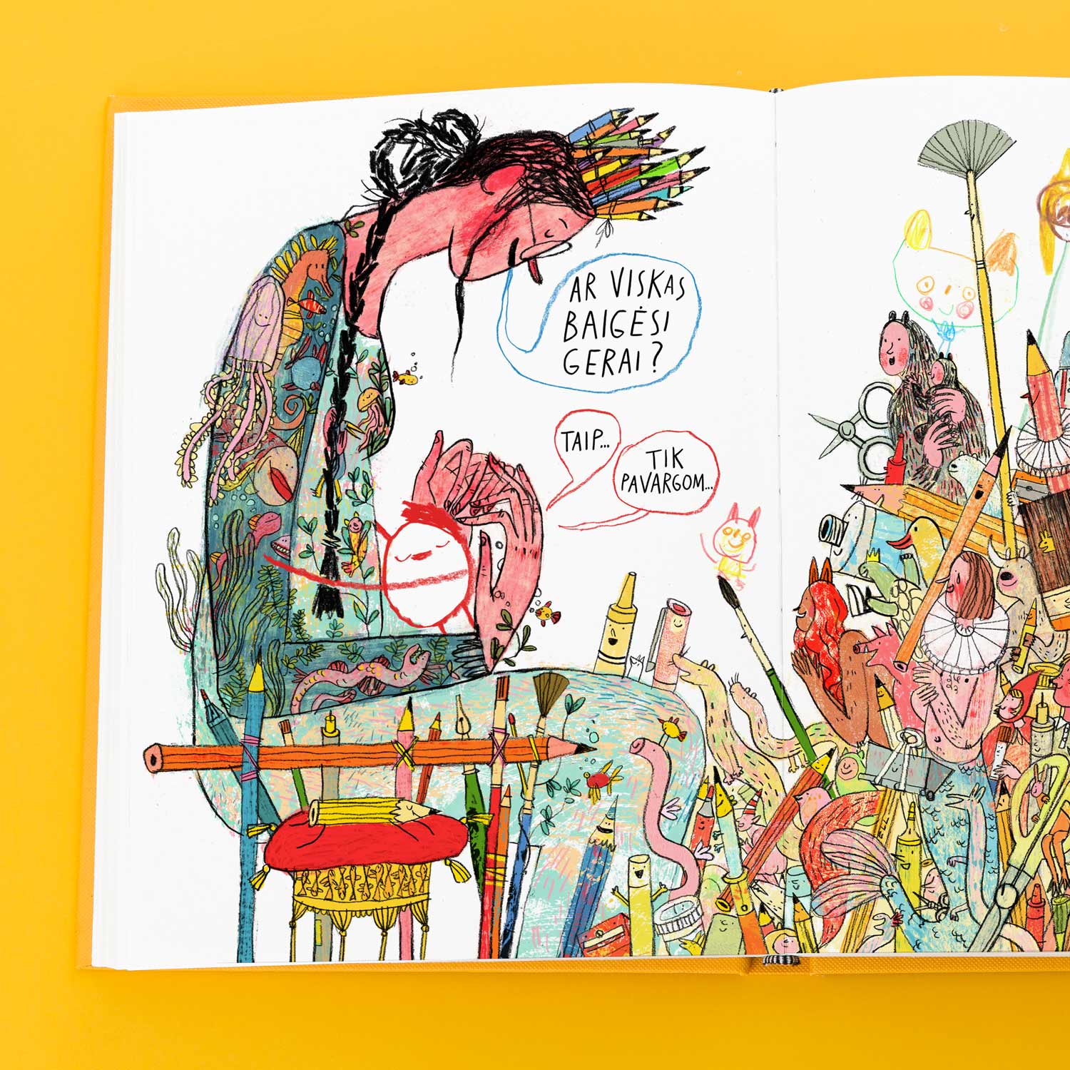 Svarbiausias Elīnos siekis buvo pabandyti iliustracijomis perteikti kūrybinio proceso esmę. Čia nėra ribos tarp realaus ir vaizduotės pasaulių. Puslapiuose pieštukai ir trintukai atgyja ir tampa pasakos personažais, stiklainiai su teptukais virsta tamsiu mišku, kalnas susiformuoja iš nebereikalingų pieštukų krūvos, o rankos vienu metu ir laiko piešimo įrankius, ir tampa istorijos veikėjais.