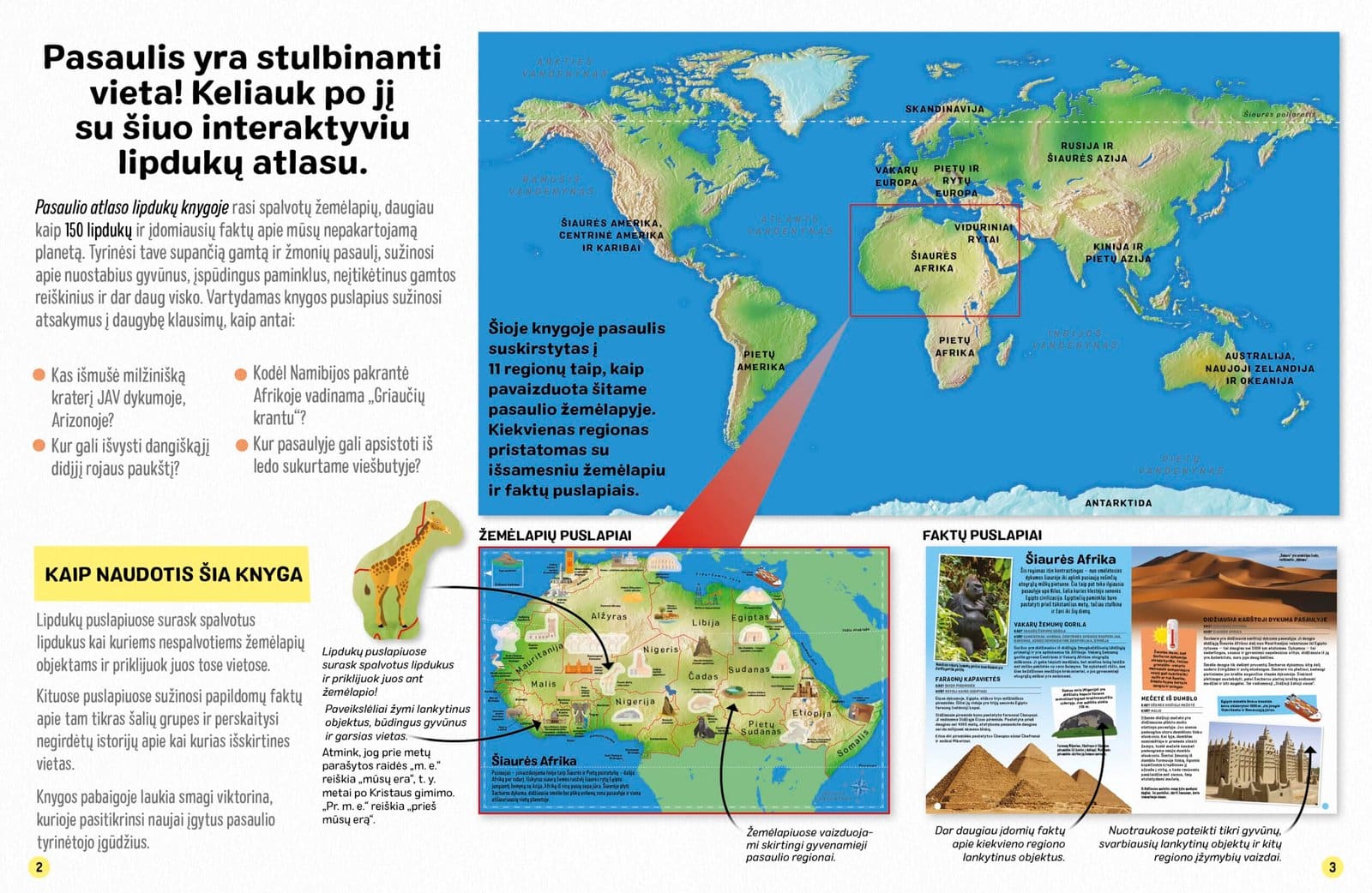 Su šia mokomąja lipdukų knyga keliauk po mūsų nuostabią planetą ir atrask pasaulio stebuklus! Spalvinguose iliustruotuose žemėlapiuose, stulbinančiose nuotraukose ir gausybėje lipdukų atgis įspūdingiausios pasaulio vietos, gyvūnai ir kiti kultūros bei gamtos stebuklai.