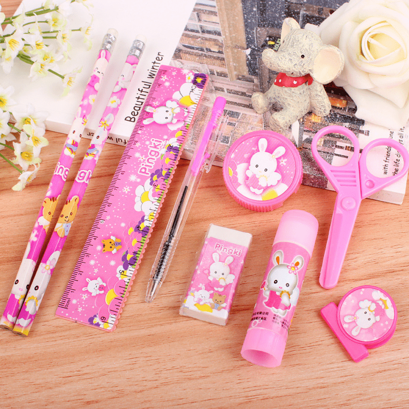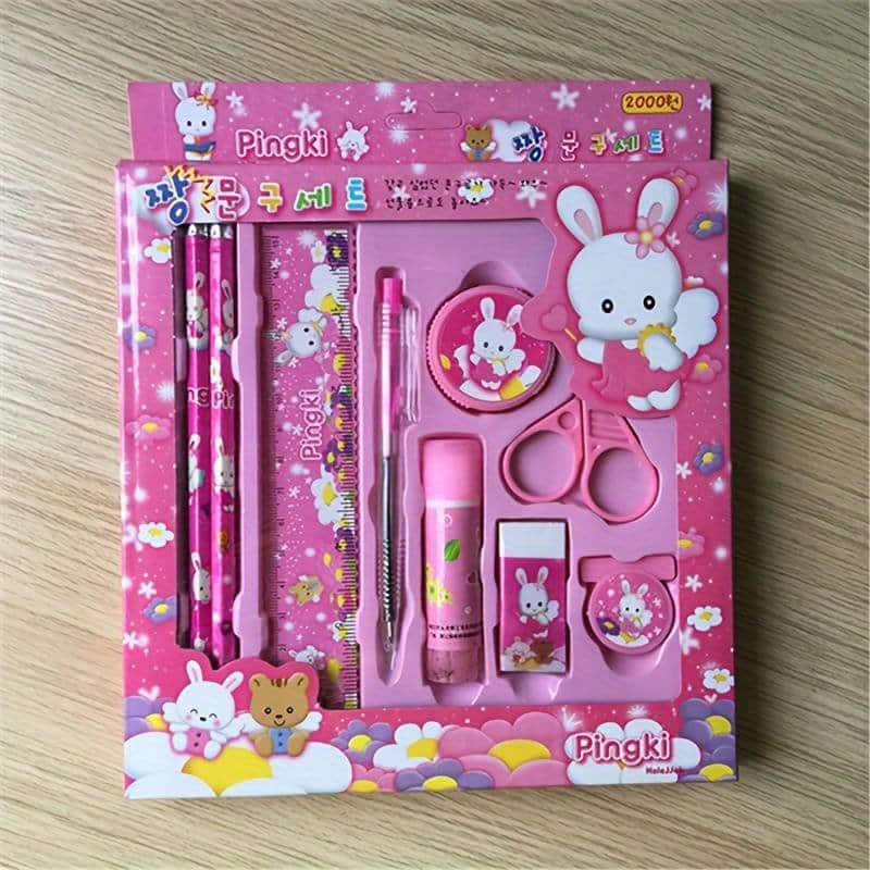 9 vienetų raštinės reikmenų rinkinys. Ši puikų rinkinį sudaro: 2 pieštukai, 1 šratinukas, 1 15 cm liniuotė, 1 tūbelė klijų klijų, 1 drožtukas, trintukas, knygos žymeklis ir žirklės.
