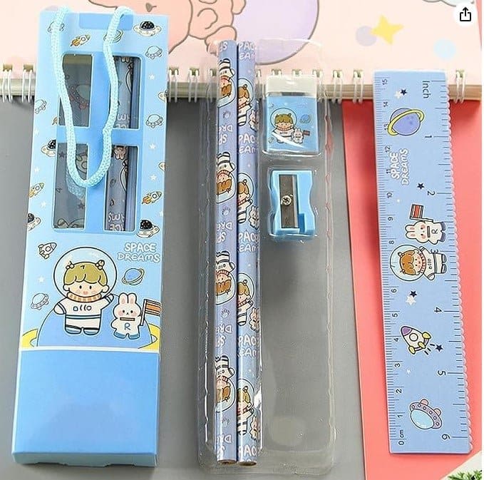 Žaismingas „Space dreams” mokyklinis rinkinys su dviem HB pieštukais, drožtuku, trintuku ir 15 cm linijine. Visi elementai dekoruoti kosmoso ir visatos animuotais motyvais. Puikus pasirinkimas, norint pradžiuginti mažuosius mokinius!