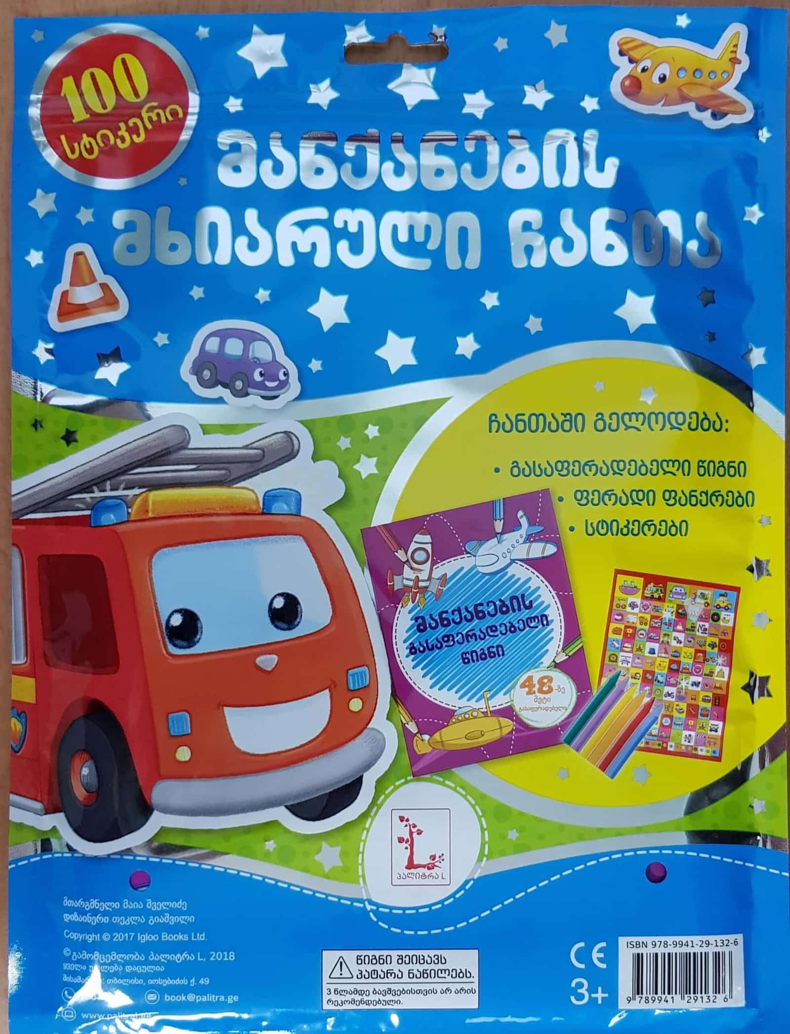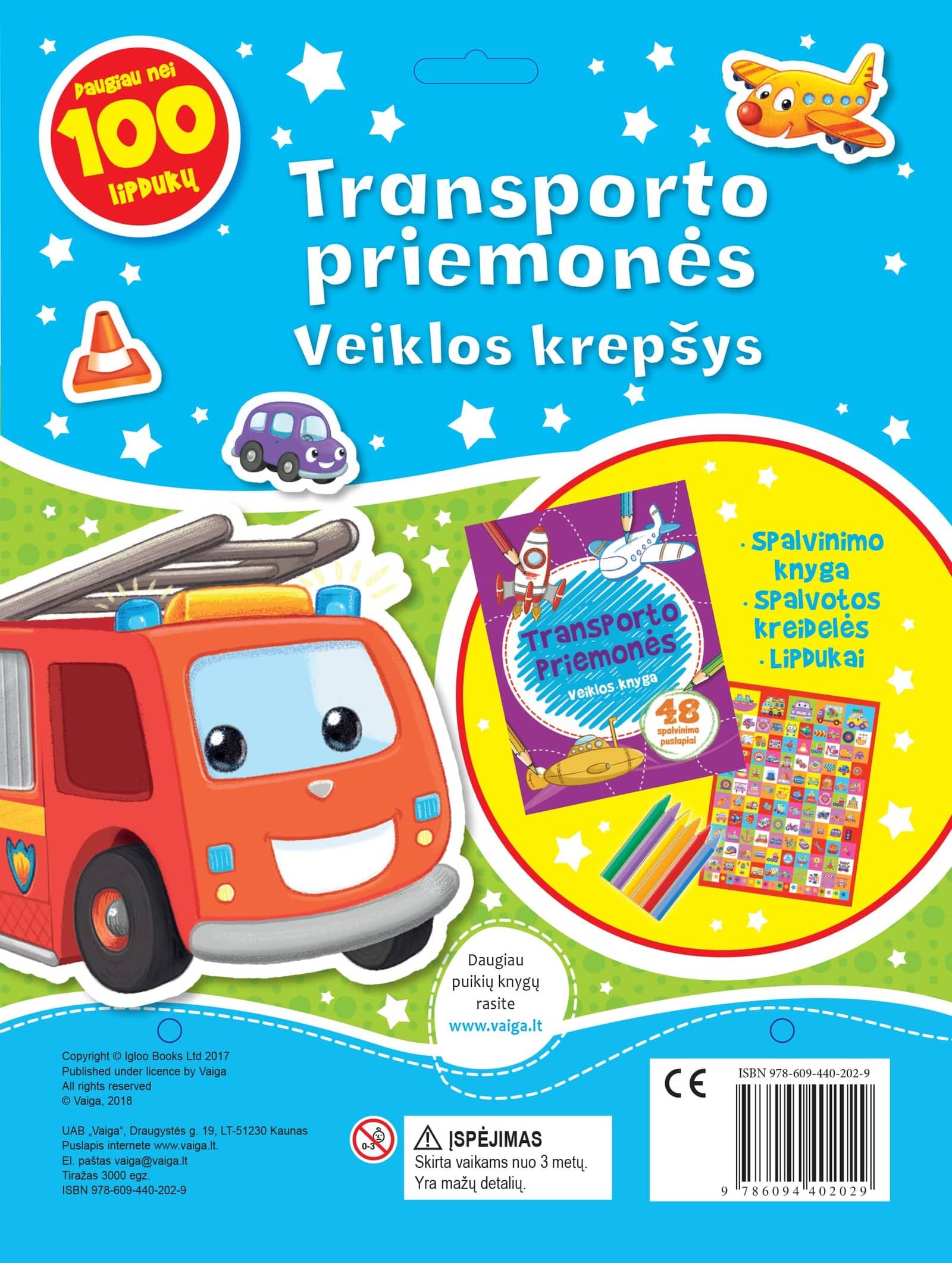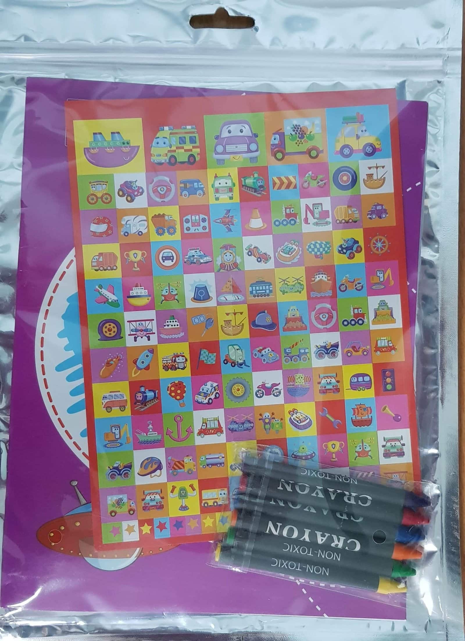 Transporto priemonės veiklos krepšį sudaro spalvinimo knyga ir 5 spalvotos kreidelės bei lipdukų lapas (daugiau kaip 100 lipdukų).