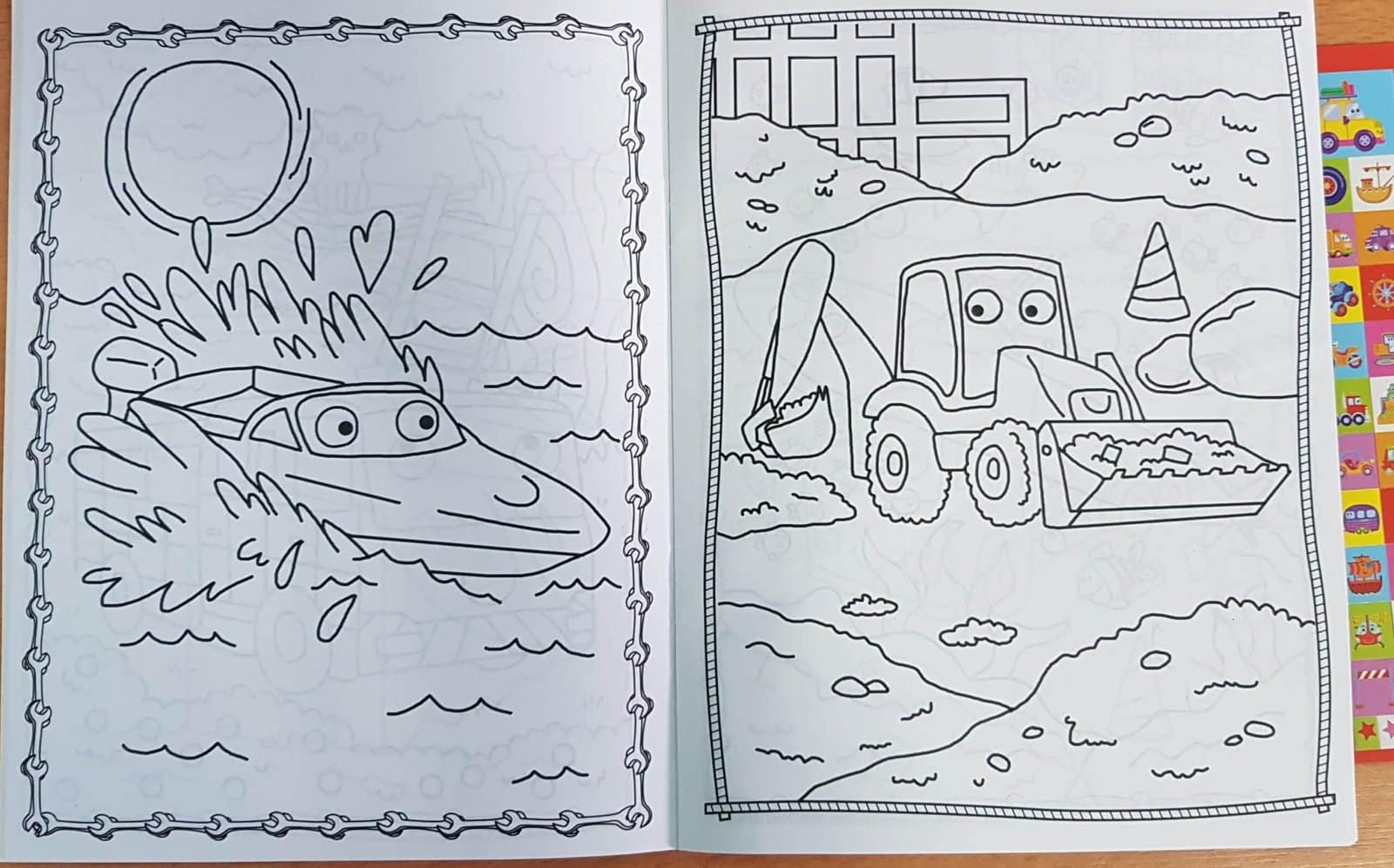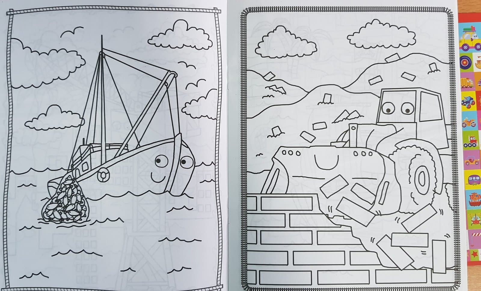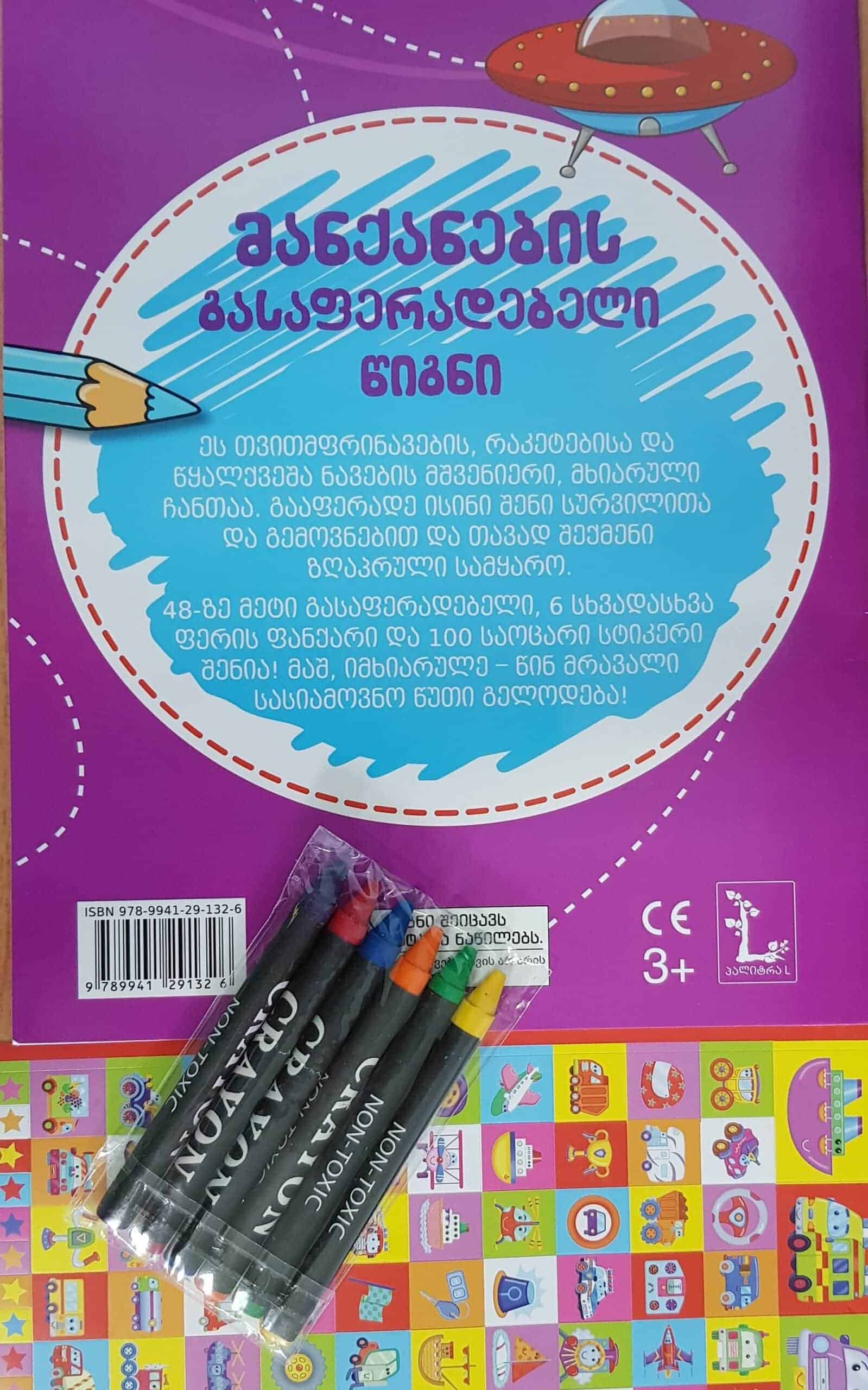 Transporto priemonės veiklos krepšį sudaro spalvinimo knyga ir 5 spalvotos kreidelės bei lipdukų lapas (daugiau kaip 100 lipdukų).